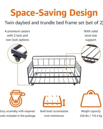 Twin over twin trundle. Black metal daybed. Strong trundle roll-out bed. Mattresses are not included. Pick up in Laurel, MT. Text if interested to set up a time and day for pick up. (406) four15-...